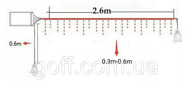 На основному горизонтальному дроті (ПРОЗРАЧНИЙ) завдовжки 2,6 метра розміщуються «сосульки», що мають різну довжину — від 30 до 60 см. Відстань між бурульками 20 см. Можливо під'єднувати кілька гірлянд в одну. 8 режимів роботи, які перемикаються за допомогою контролера.